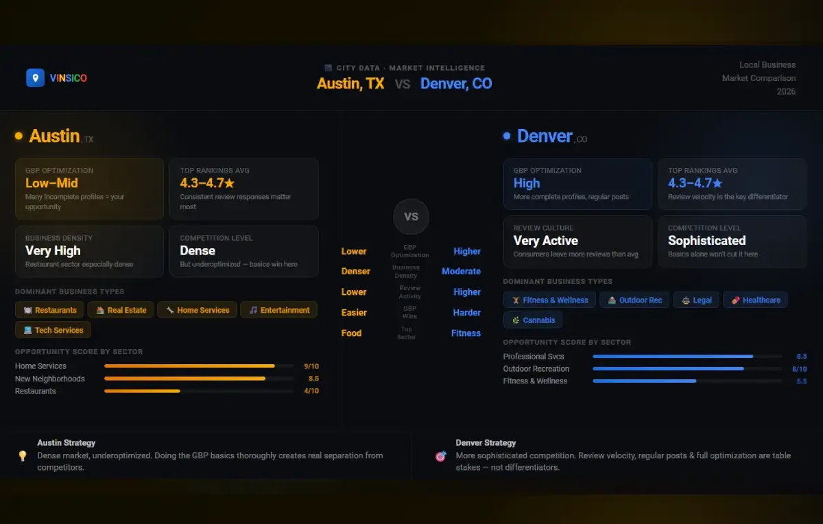 The restaurant and outdoor recreation sectors drive a lot of local search volume. Professional services (legal, financial, consulting) face growing competition. Denver's review culture is relatively strong - consumers here leave reviews at a higher rate than many comparable markets.